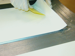 Position the flexible mold over the area to be repaired, moving it around until information technology locks onto the pattern. Tape one end down securely and roll back the flexible mold until the repair area is accessible. - Pour catalyzed gelcoat (you can use epoxy only it will crave painting) near the flexible mold.