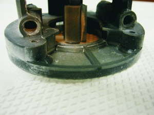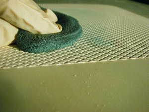 the opaque white gelcoat or you can see the night substrate through information technology, y'all must then make full the dark low spots with gelcoat so that afterwards molding a new not-skid you practise non meet the nighttime laminate through the thinnest, lowest parts of the gelcoat pattern. If the harm went beyond the base of operations gelcoat thickness, or you are finishing a structural repair, you volition have to router a void to fill up with a thick enough layer of gelcoat to make an opaque base for the design. This layer of gelcoat is so machined with a shallower pass on the router, to level the opaque layer and establish the base of the non-slip design. Interruption the corner of the routed area with sandpaper.